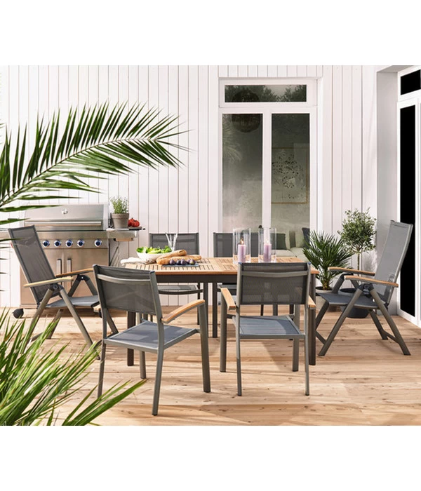 Wenn im Sommer nach einer stressigen Woche der Kalender den Freitag anzeigt und die Wettervorhersage bestes Sommerwetter für die nächsten Tage prophezeit, werden Sie bestimmt ein entspanntes Wochenende im Garten oder auf dem Balkon planen. Und wer könnte Sie besser durch dieses tolle Wochenende begleiten als der Stapelstuhl Colmar! Denn der Stapelstuhl Colmar ist so bequem, dass Sie am liebsten jede Stunde in ihm verbringen würden – vom Frühstück in der Morgensonne bis zum Mitternachtsimbiss unterm Sternenhimmel. Doch dieser Gartenstuhl wird Sie nicht nur mit seinem unvergleichlichen Sitzkomfort verwöhnen, sondern Ihre Terrasse auch mit seiner edlen Optik bereichern. Nicht ohne Grund ist die Kombination aus einem Leichtmetall-Gestell, modernem Funktionsgewebe und edlen Teak-Armlehnen, wie sie der Stapelstuhl Colmar zeigt, im Moment absolut Trend, denn sie vereint moderne Funktionalität mit wohnlicher Ausstrahlung.