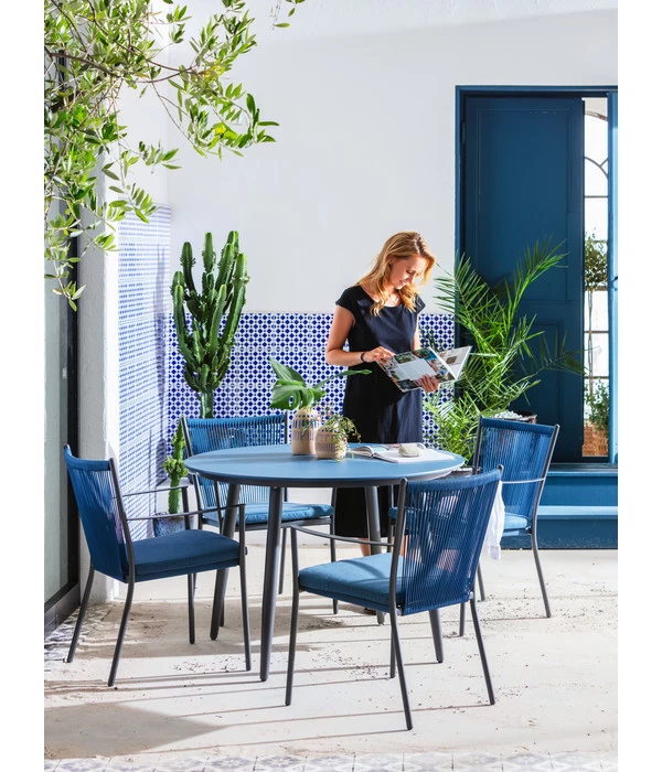 Blau ist nicht nur die Farbe des Himmels an einem schönen Sommertag, blau sind auch Ihre neuen Gartenmöbel. Zumindest, wenn Sie sich für den Dehner Stapelstuhl ‘Delphi‘ entschieden haben. Da hier das leuchtende Blau aber mit Schwarz kombiniert wurde, hält eine topmodische Farbkombination bei Ihnen auf der Terrasse Einzug, die sicherlich die Bewunderung Ihrer Freunde ernten wird, wenn Sie zur Einweihungsparty einladen. Und auch die Nachbarn werden neugierige Blicke hinüberwerfen, denn solche Möbel sieht man nicht in jedem Garten. Und neben der Optik überzeugt der Gartenstuhl auch mit ausgezeichnetem Sitzkomfort, für den neben dem gepolsterten Sitzkissen auch die Armlehnen sorgen. Setzen Sie mit dem blauen Dehner Stapelstuhl ‘Delphi‘ frische Akzente in Ihrem Outdoor-Bereich und lassen sich von der Farbe zum Träumen von einem unendlich langen Sommer verführen! Der gefühlt noch schöner wird, wenn Sie die Stühle um den passenden blauen Tisch aus der gleichnamigen Serie gruppieren…